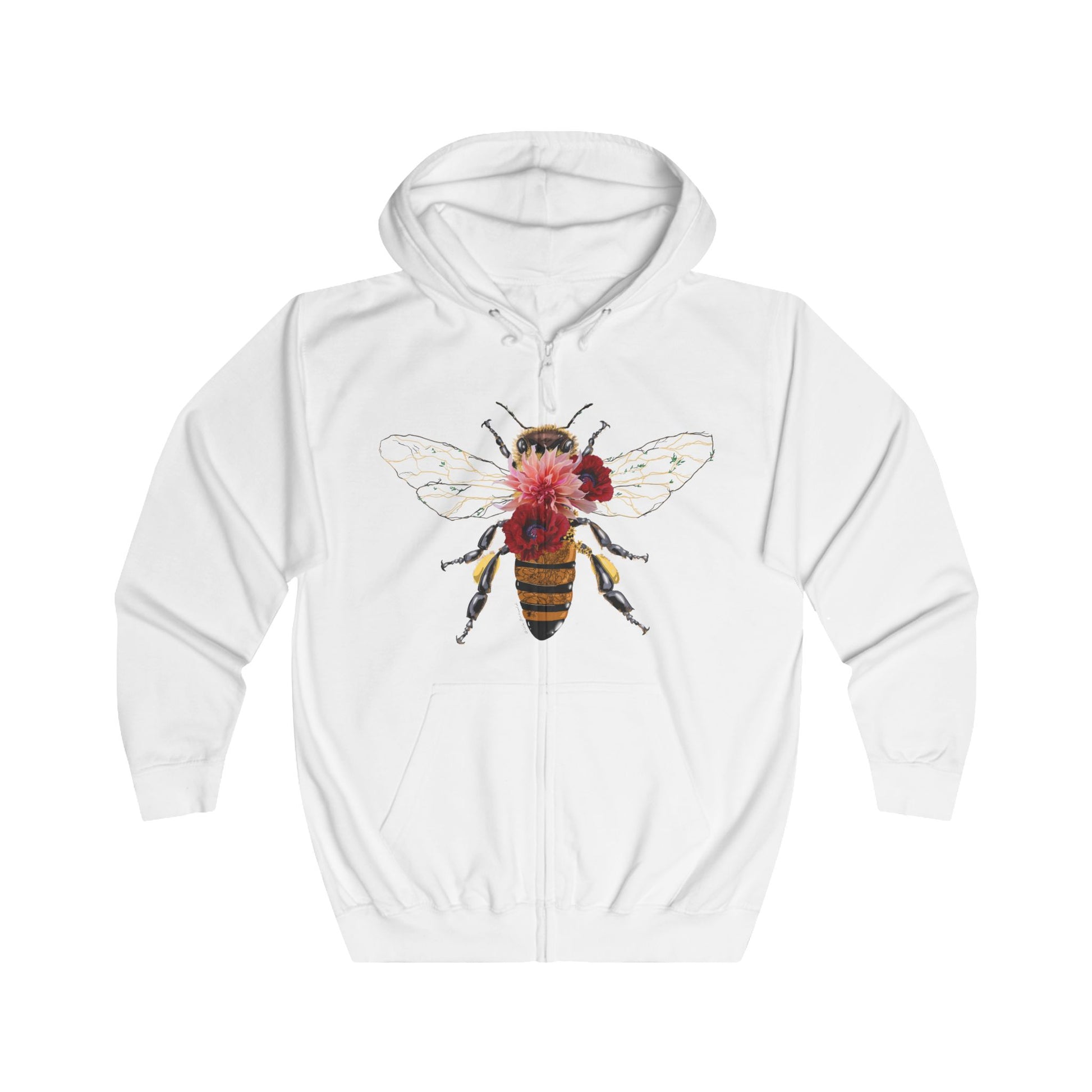 This zip-up hoodie carries a quiet, garden-warm sensibility — soft white fabric wrapped around a delicate, nature-forward print. A realistic honeybee with a burst of floral color on the chest gives the piece an artisan, hand-touched feel, while a small golden butterfly and subtle script near the lower back add a hidden, personal detail. It wears roomy and relaxed, with a double-layered hood and roomy kangaroo pockets to tuck cold hands or a phone. The medium-heavy weight offers cozy warmth without bulk, making it a go-to layer for cool mornings, late-night walks, or weekend market runs. Thoughtful construction — combed, ring-spun cotton with polyester for durability — keeps the print crisp and the fit lived-in over time. If you gravitate toward slow-fashion aesthetics and nature-inspired accents, this hoodie slips into everyday life like an old friend.